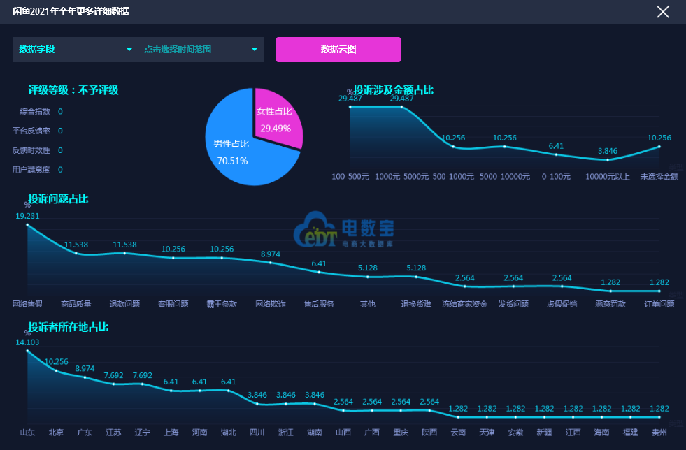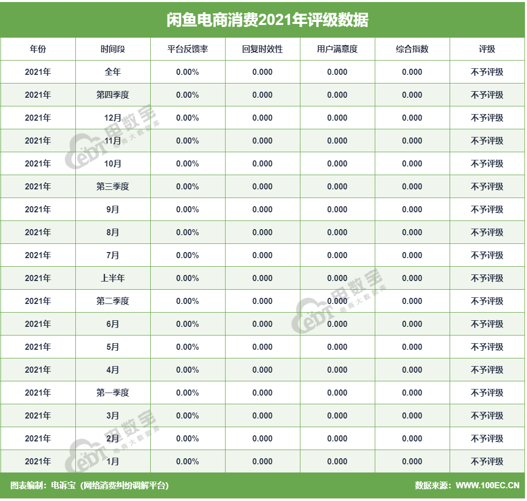 据网经社旗下电商大数据库“电数宝”监测数据显示,2021年“闲鱼”(淘宝(中国)软件有限公司运营)共获得18次消费评级,均获“不予评级”。
