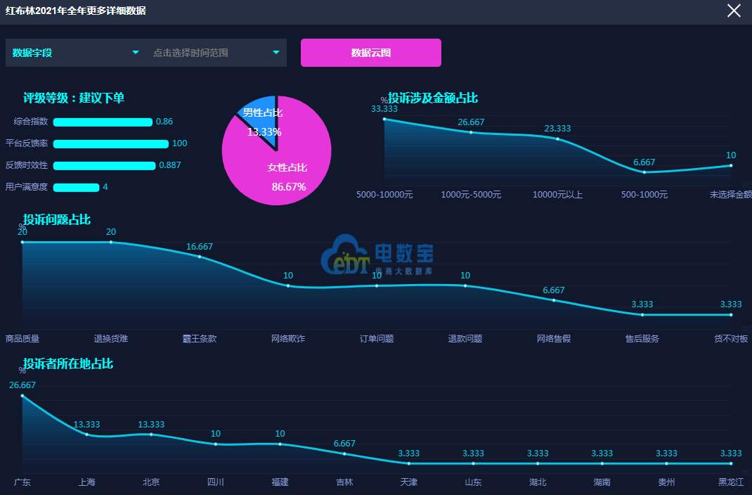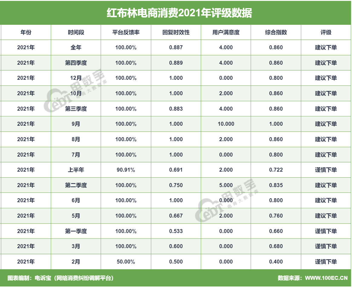 据网经社旗下电商大数据库“电数宝”监测数据显示,从2019年至2021年,“红布林”共获47次消费评级,其中33次获“建议下单”评级,12次获“谨慎下单”评级,2次获“不建议下单”评级。2021年“红布林”(红布林集团股份有限公司)共获得15次消费评级,其中3次获“谨慎下单”,12次获“建议下单”,2021年一年整体消费评级为“建议下单”。
