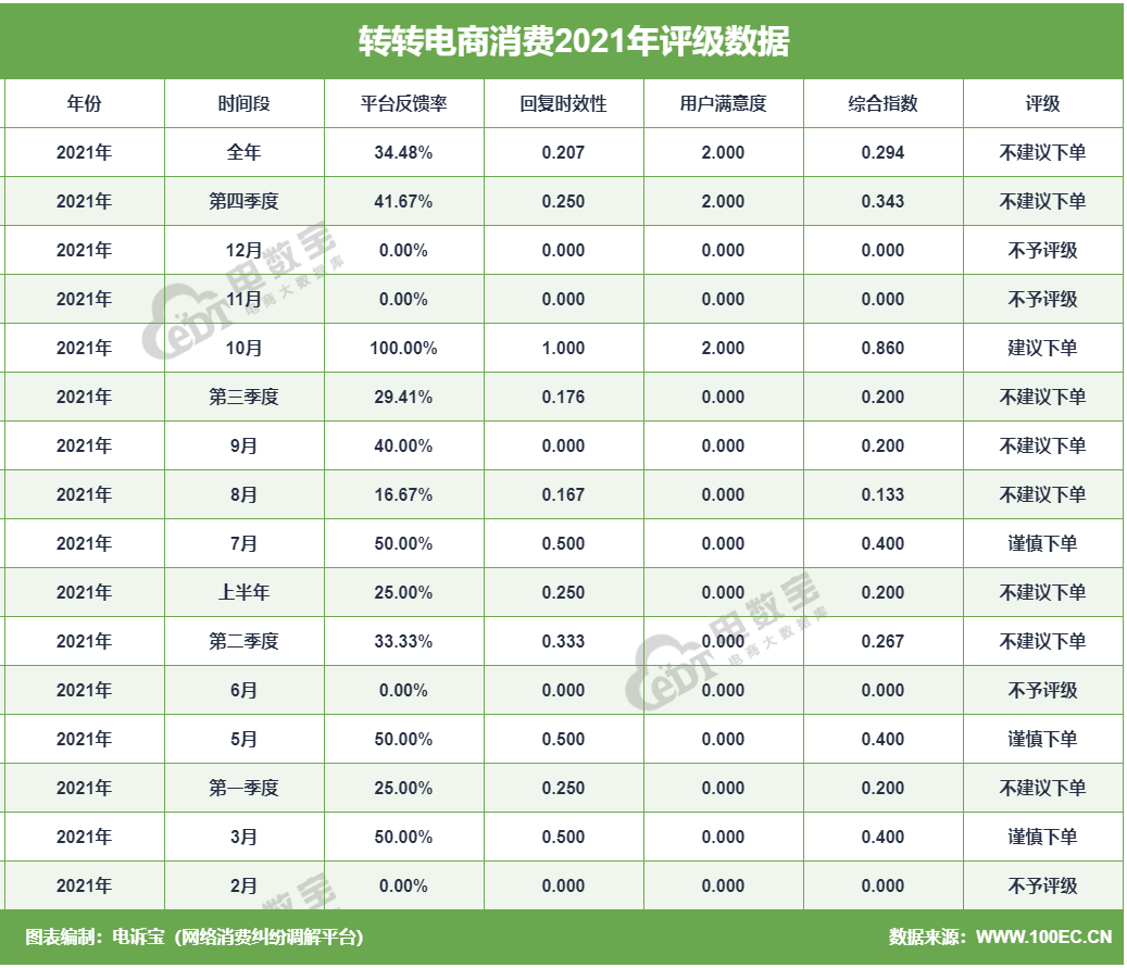 据网经社旗下电商大数据库“电数宝”监测数据显示,从2018年至2021年“转转”共获得70次消费评级,其中,41次获“不建议下单”评级,22次获“不予评级”评级、6次获“谨慎下单”评级、1次获“建议下单”评级。2021年“转转”(北京转转精神科技有限责任公司)共获得16次消费评级,其中8次获“不建议下单”评级,1次获“建议下单”评级,3次获“谨慎下单”评级,4次获“不予评级”评级,2021年一年整体消费评级为“不建议下单”。