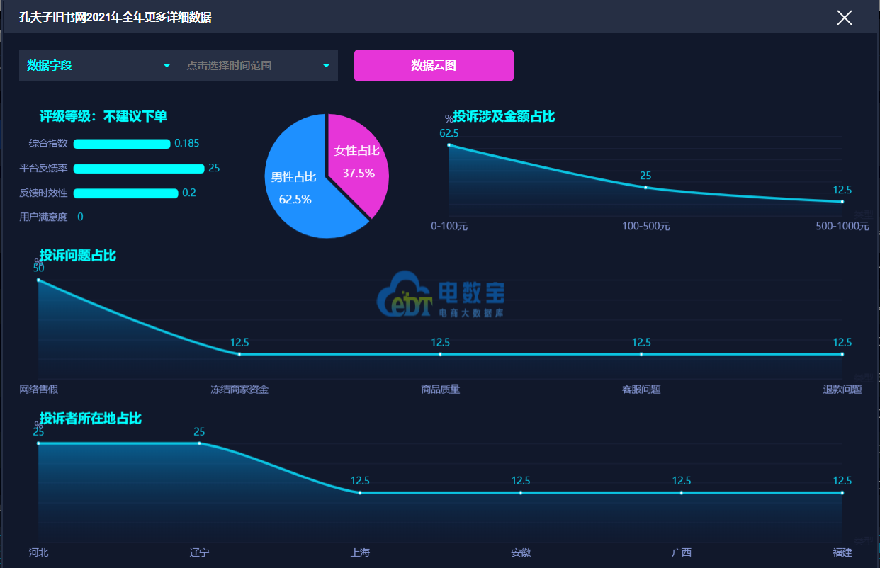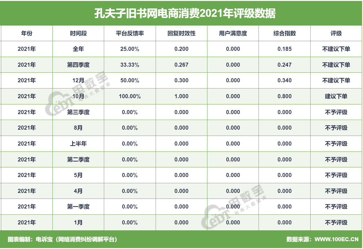 据网经社旗下电商大数据库“电数宝”监测数据显示,从2019年至2021年,“孔夫子旧书网”共获28次消费评级,其中24次获“不予评级”评级,3次获“不建议下单”评级,1次获“建议下单”评级。“孔夫子旧书网”2021年共获得12次消费评级,其中,8次获“不予评级”评级、3次获“不建议下单”评级、1次获“建议下单”评级,2021年获“不建议下单”评级。