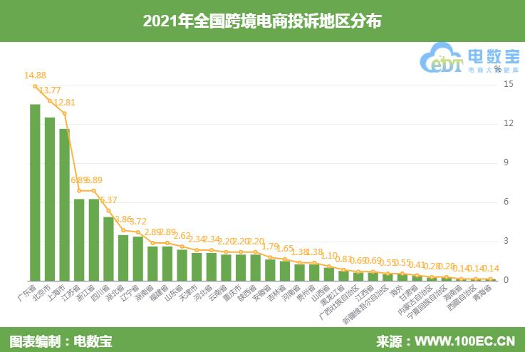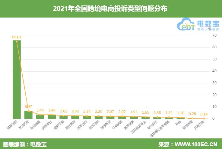 据“电诉宝”显示,2021年全国跨境电商用户投诉问题类型排名前十的依次为:退款问题(65.01%)、发货问题(6.47%)、商品质量(3.44%)、网络欺诈(3.44%)、虚假促销(2.62%)、霸王条款(2.62%)、退换货难(2.34%)、物流问题(2.20%)、网络售假(2.07%)、订单问题(2.07%)。