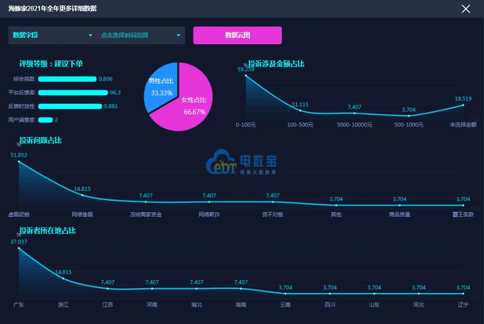 据网经社旗下电商大数据库“电数宝”监测数据显示,2021年“海豚家”共获得14次消费评级,其中,11次获“建议下单”评级、2次获“谨慎下单”评级、1次获“不建议下单”评级,最终获“建议下单”评级。同时,“海豚家”存在虚假促销、网络售假、冻结商家资金、货不对板、霸王条款的问题。