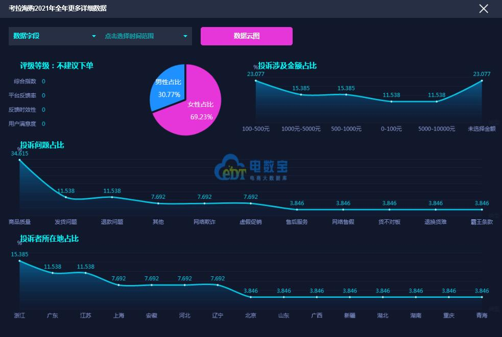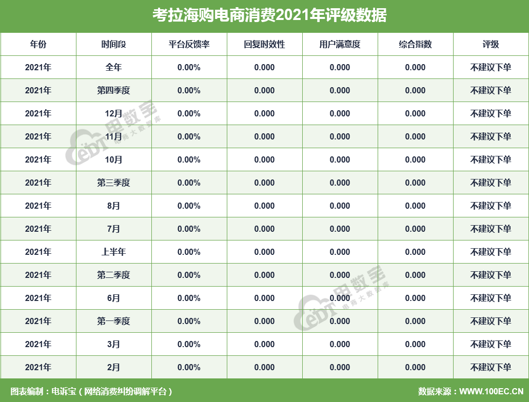 据网经社旗下电商大数据库“电数宝”监测数据显示,2021年“考拉海购”共获得14次消费评级, 均获“不建议下单”评级。同时,“考拉海购”存在商品质量、发货问题、退款问题、虚假促销等问题。