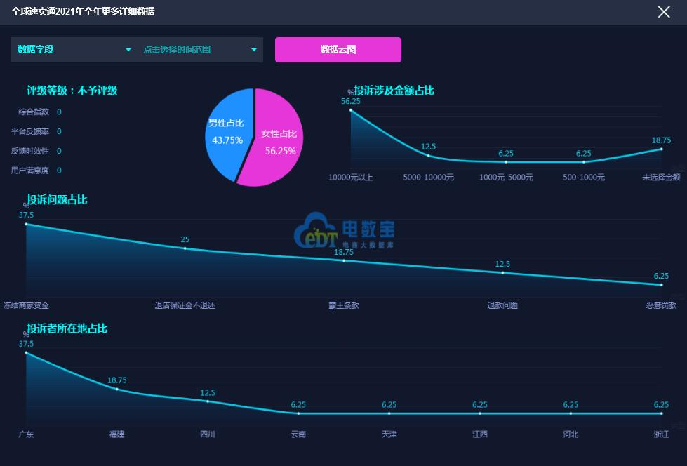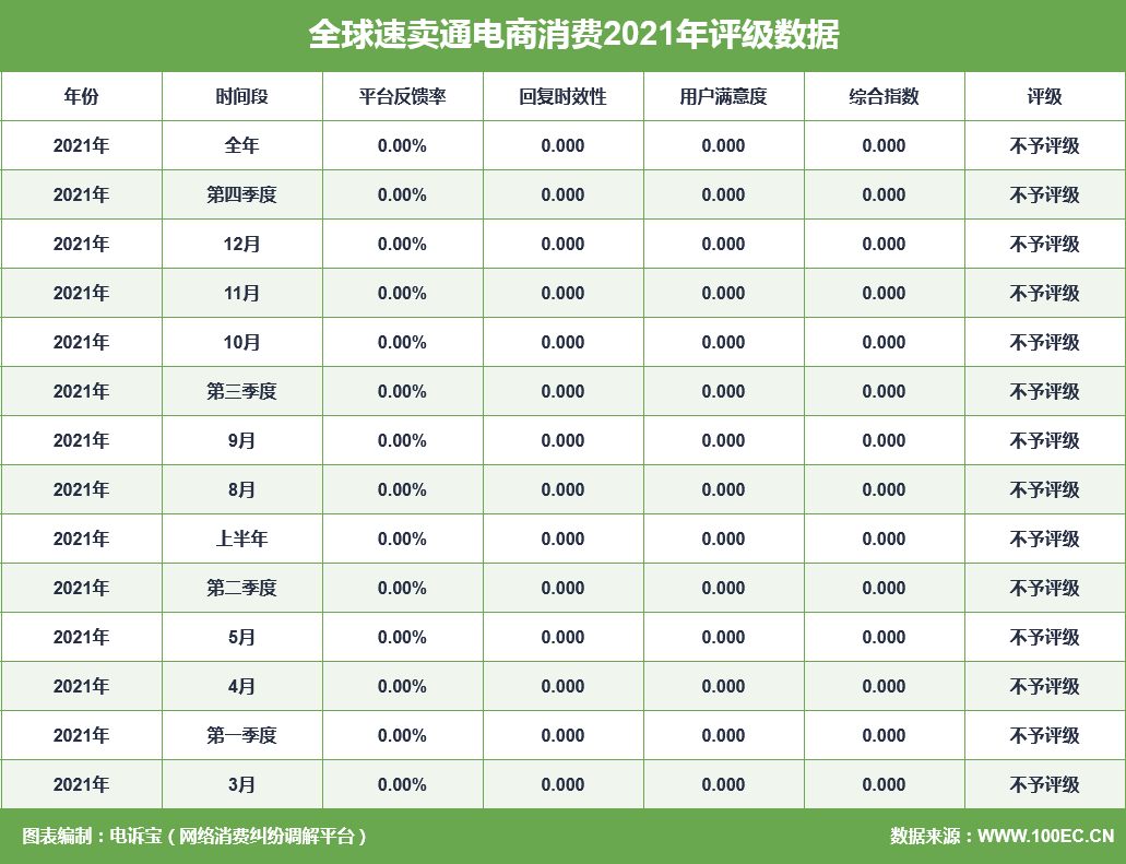据网经社旗下电商大数据库“电数宝”监测数据显示,2021年“全球速卖通”共获得14次消费评级,均获“不予评级”。同时,“全球速卖通”存在恶意罚款、退款问题、冻结商家资金、退店保证金不退还的问题。