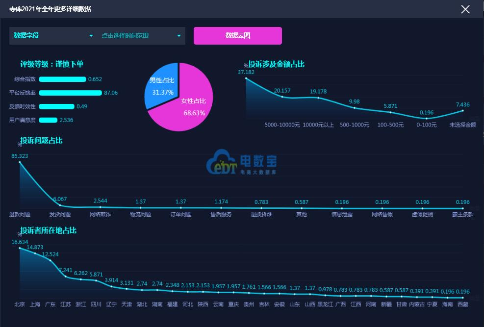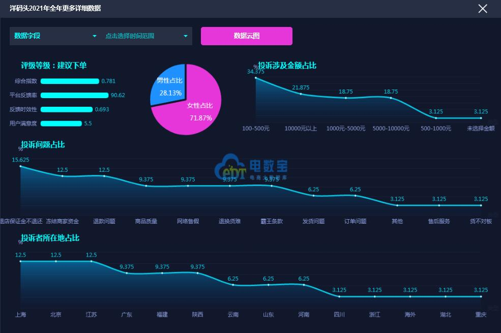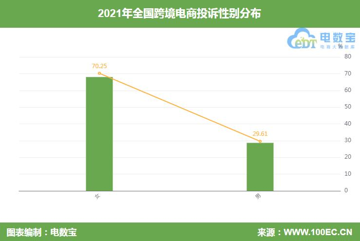 据“电诉宝”显示,跨境电商2021年女性用户投诉比例为70.25%,男性用户投诉比例为29.61%。