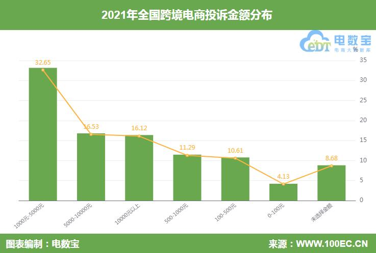据“电诉宝”显示,2021年跨境电商投诉金额分布主要集中在1000-5000元(32.65%)、5000-10000元(16.53%)、10000元以上(16.12%)、500-1000元(11.29%)、100-500元(10.61%)、0-100元(4.13%)以及未选择金额(8.68%)。