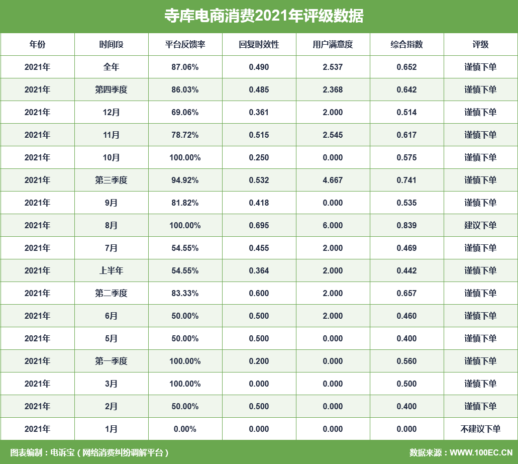 据网经社旗下电商大数据库“电数宝”监测数据显示,2021年 “寺库”共获得17次消费评级,15次获“谨慎下单”评级、1次获“建议下单”评级、1次获“不建议下单”评级,最终获“谨慎下单”评级。同时,“寺库”存在退款问题、发货问题、订单问题、物流问题等。