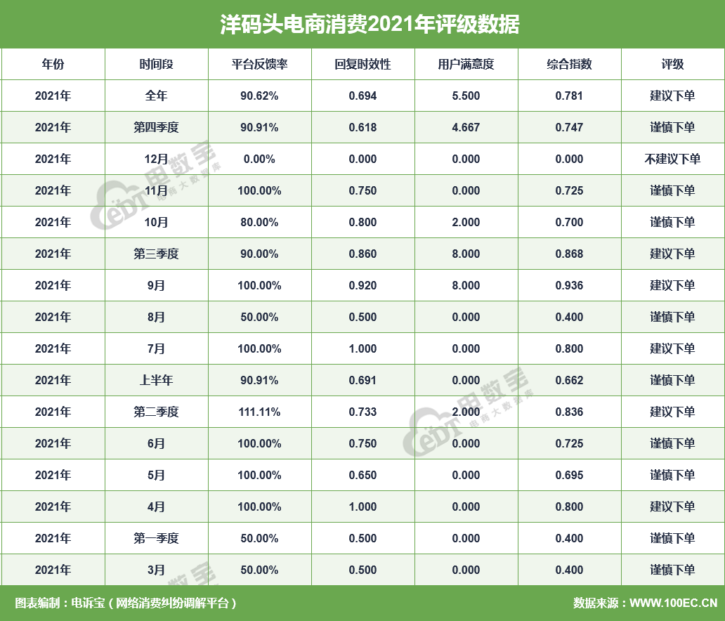 据网经社旗下电商大数据库“电数宝”监测数据显示,2021年“洋码头”共获得16次消费评级,其中,6次获“建议下单”评级、9次获“谨慎下单”评级、1次获“不建议下单”评级,最终获“建议下单”评级。同时,“洋码头”存在退款问题、商品质量、退店保证金不退还、退换货难等问题。
