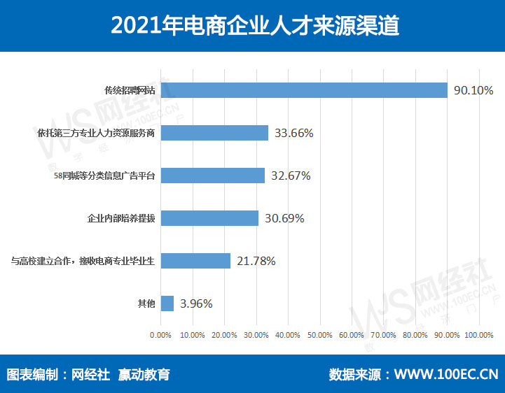被调查企业中,依托传统招聘网站招聘的占90.10%;依托第三方专业人力资源服务商的占33.66%;通过58同城等分类信息广告平台的占32.67%;通过企业内部培养提拔的占30.69%;高校建立合作,接收电商专业毕业生的企业占21.78%。