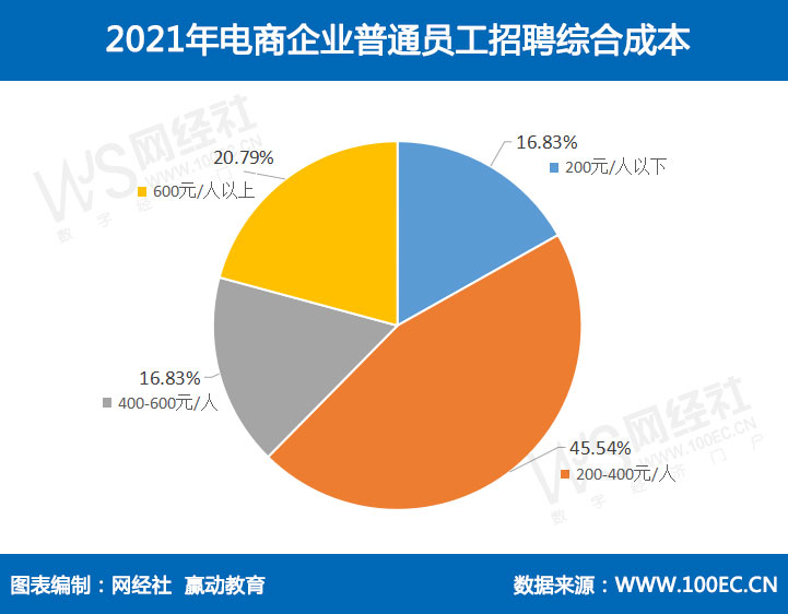 被调查企业中,普通员工招聘成本在200元/人以下占16.83%;200-400元/人的占45.54%;400-600元/人的占16.83%;600元/人以上的占20.79%。