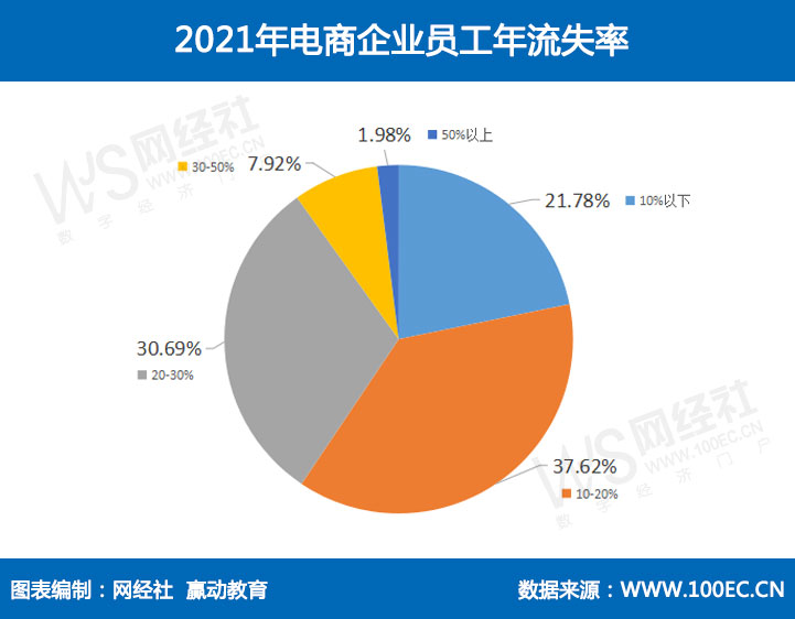 被调查企业2021年员工流失率,10%以下的企业占21.78%;10-20%的企业占37.62%;20-30%的企业占30.69%;30-50%的企业占7.92%;50%以上的企业占1.98%。