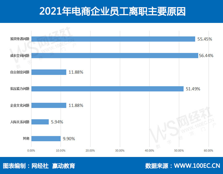 薪酬问题、成长空间问题、抗压问题一直是员工离职的三大起因。 自主创业问题的比例相比2020年下降了15.67%,这应该和近两年电商行业发展放缓,创业成本上升,疫情反复等原因有关。