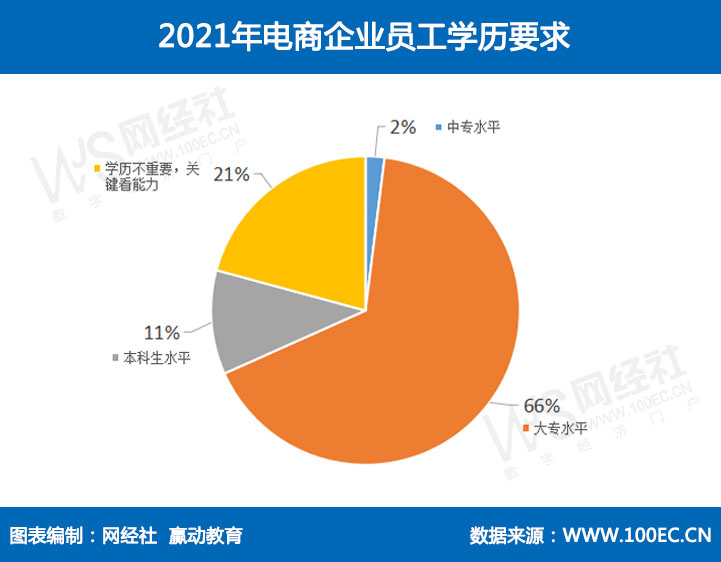 从调查数据来看,要求大专学历的企业比例还是最高,也和大多数电商企业要求的人才层次是匹配的。而选择学历不重要,关键看能力的企业,主要还集中在最基础岗位。