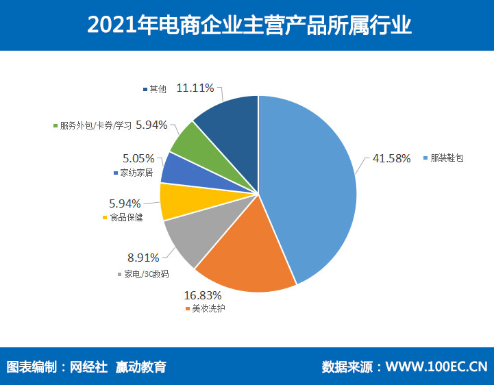 被调查企业主营商品中,服装鞋包占41.58%、美妆洗护占16.83%、家电/3C数码占8.91%、食品保健占5.94%、家纺家居占5.05%、服务外包/卡券/学习占5.94%,其他占11.11%。