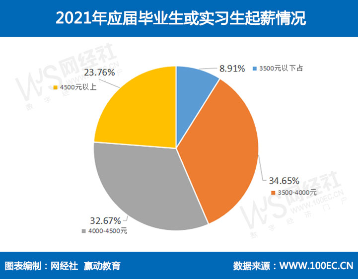 被调查企业中,企业录用的应届毕业生或实习生的起薪3500元以下占8.91%;3500-4000元占34.65%;4000-4500元占32.67%;4500元以上占23.76%。