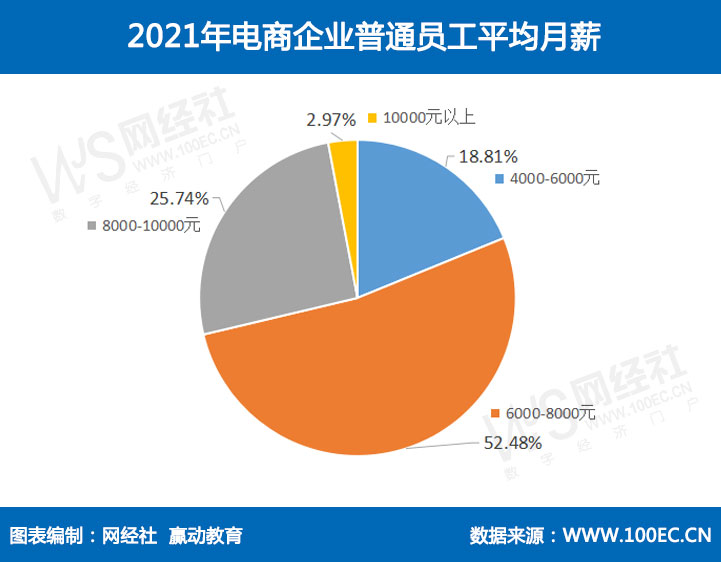 从数据来看,电商企业普通员工的平均月薪与2020年基本持平。其中,6000-8000元档成为主流,达到52.48%。效益好点的企业能达到8000-10000元档,占比25.74%。