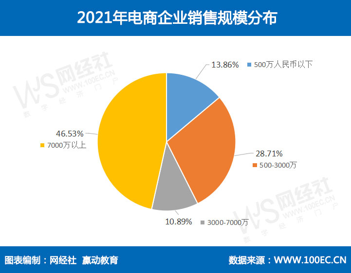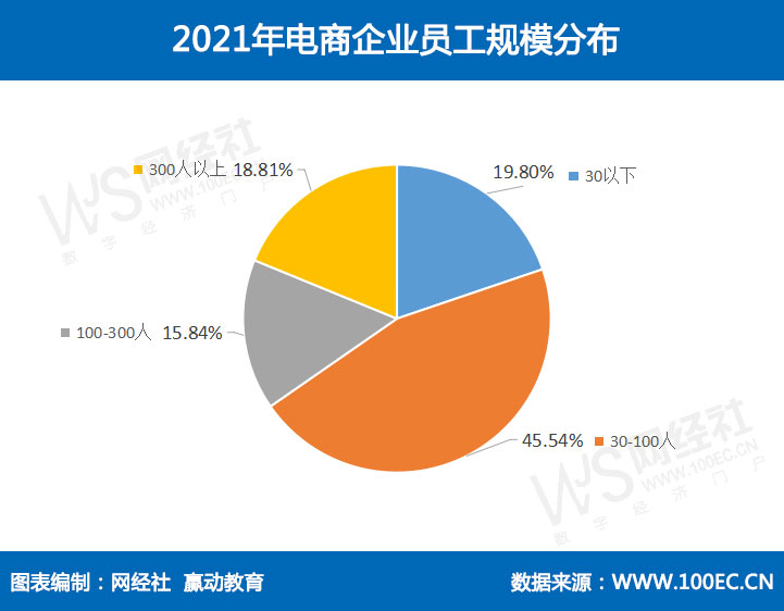 员工规模在30-100人的电商企业比例已经连续多年排在第一,基本反映了电商行业的企业规模现状。