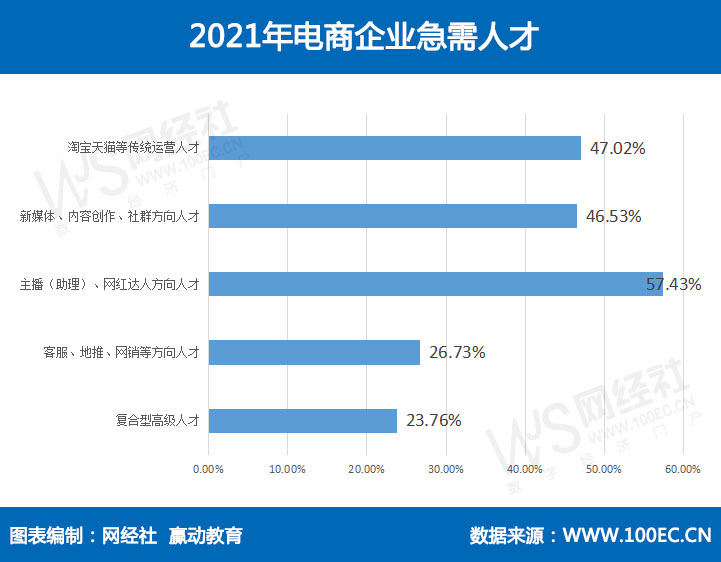 被调查企业中,47.02%的企业急需淘宝天猫等传统运营人才;46.53%的企业急需新媒体、内容创作、社群方向人才。57.43%的企业急需主播(助理)、网红达人方向人才;26.73%的企业急需客服、地推、网销等方向人才;23.76%的企业急需复合型高级人才。