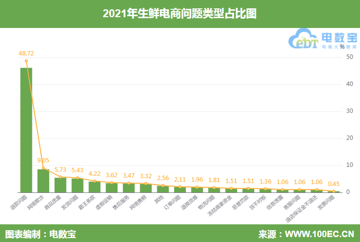 国内知名网络消费纠纷调解平台“电诉宝”(315.100EC.CN)显示,退款问题、网络欺诈、商品质量、发货问题、霸王条款、虚假促销、售后服务、网络售假等问题是2021年全年生鲜电商投诉的主要问题。