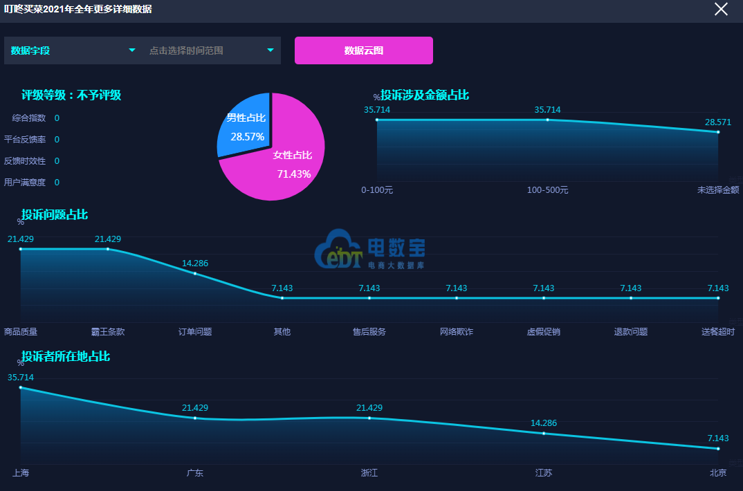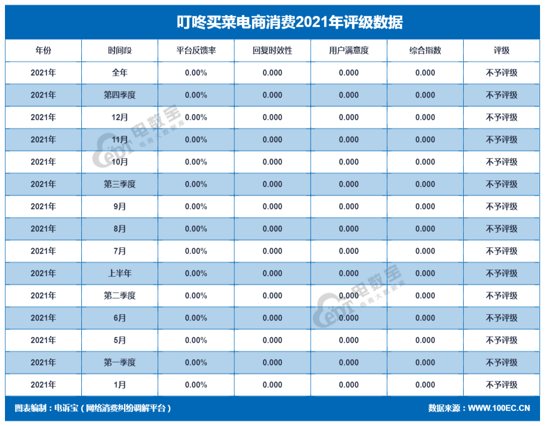 据网经社旗下电商大数据库“电数宝”监测数据显示,2021年上海壹佰米网络科技有限公司旗下“叮咚买菜”共获得15次消费评级,均获“不予评级”评级。同时,“叮咚买菜”存在退款问题、虚假促销、霸王条款、订单问题等问题。