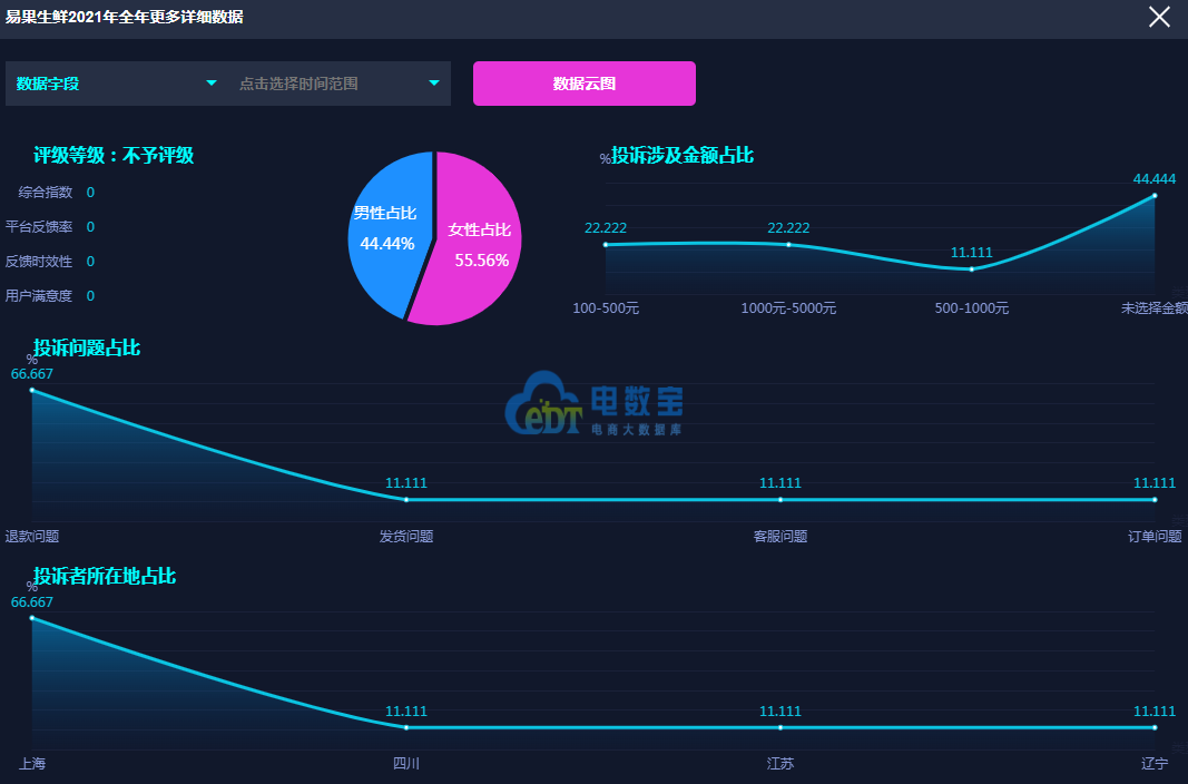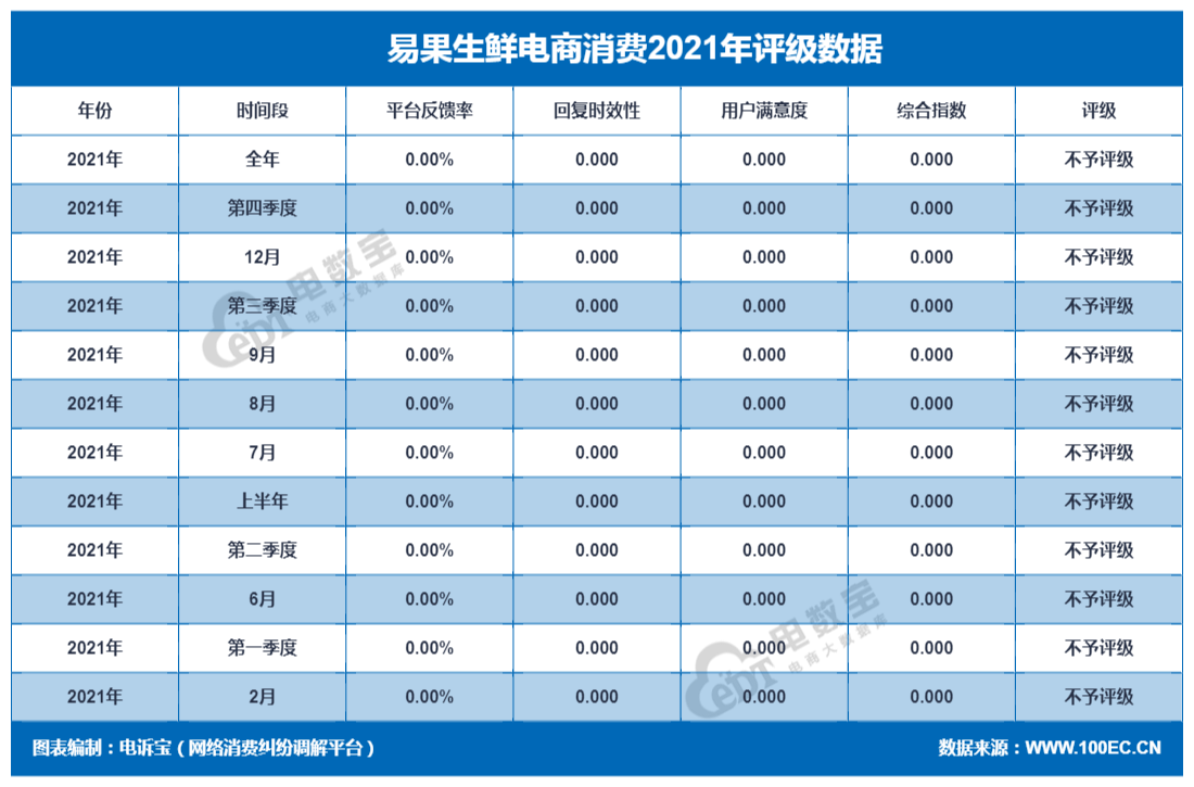 据网经社旗下电商大数据库“电数宝”监测数据显示,2021年上海易果电子商务有限公司旗下“易果生鲜”共获得12次消费评级,均获“不予评级”评级。同时,“易果生鲜”存在退款问题、发货问题、客服问题等问题。
