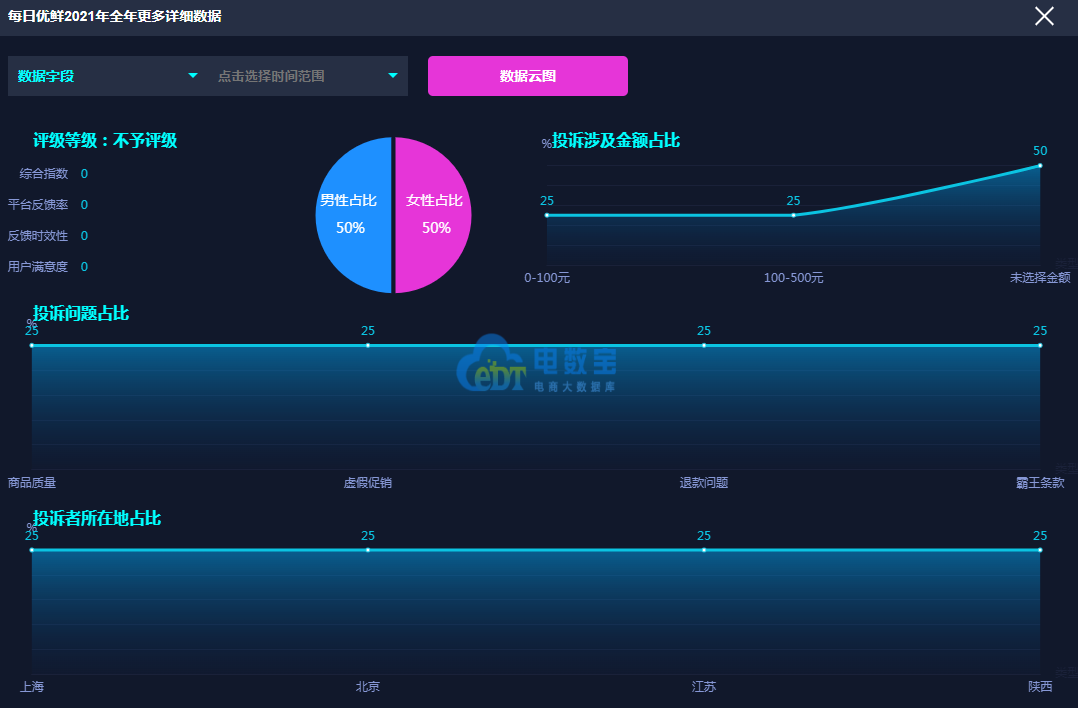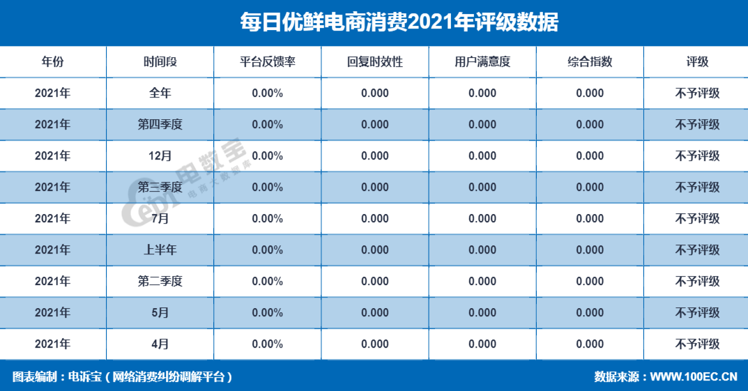 据网经社旗下电商大数据库“电数宝”监测数据显示,2021年北京每日优鲜电子商务有限公司旗下的 “每日优鲜”共获得9次消费评级,均获“不予评级”评级。同时,“每日优鲜”存在订单问题、退款问题、霸王条款、虚假促销、商品质量等问题。
