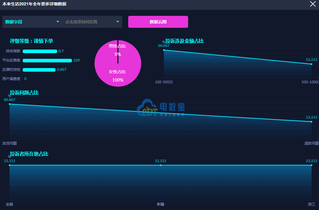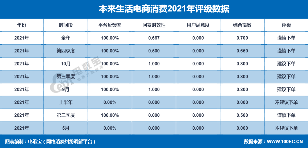 据网经社旗下电商大数据库“电数宝”监测数据显示,2021年北京本来工坊科技有限公司旗下“本来生活”共获得8次消费评级,其中,3次获“谨慎下单”评级、2次获“不建议下单”评级、3次获“建议下单”评级,2021年获“谨慎下单”评级。同时,“本来生活”存在商品质量、发货问题、退款问题、网络售假等问题。