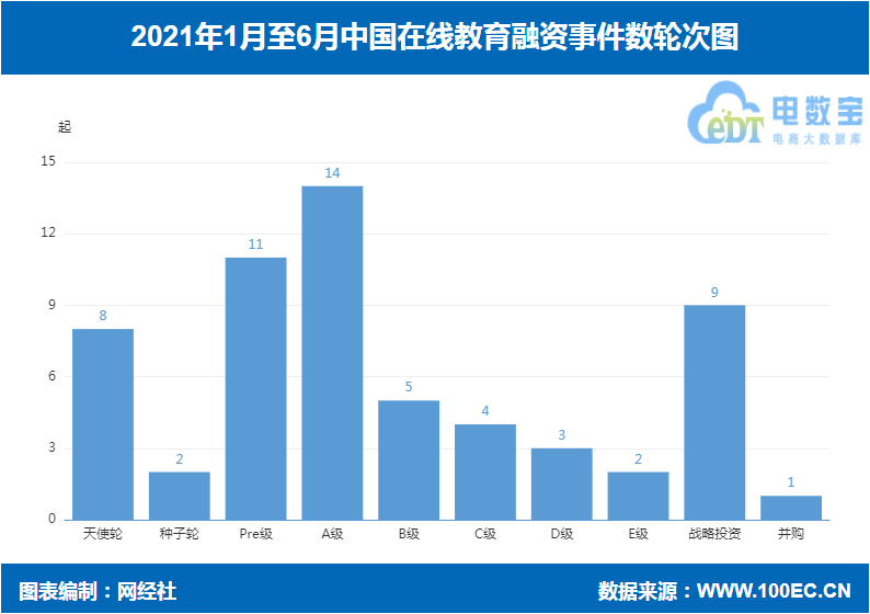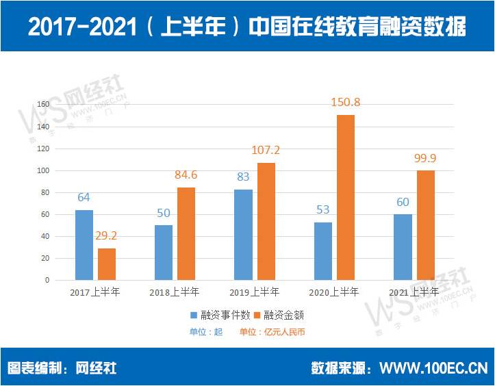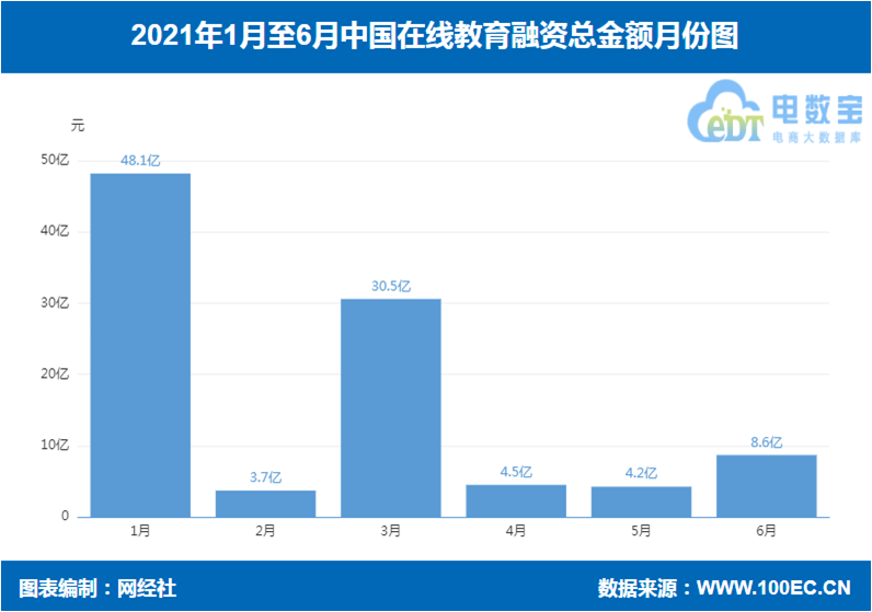 据网经社“电数宝”大数据库显示,2021上半年中国在线教育共发生60起融资,融资额99.9亿元人民币。