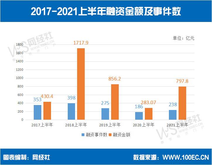 据网经社“电数宝”(DATA.100EC.CN)电商大数据库显示 ,2021上半年电子商务融资事件为238起,同比去年同期186起上升27.96%;融资总金额达797.8亿元,同比去年同期283.07亿元上升181.84%。