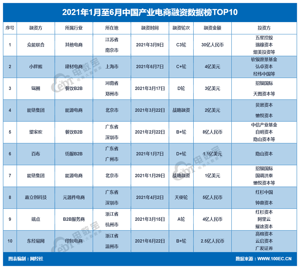 上半年产业电商十大融资事件分别为:众能联合(30亿人民币)、小胖熊(4亿美元)、锅圈(3亿美元)、能链集团(2亿美元、1亿美元)、望家欢(8亿人民币)、百布(1.1亿美元)、矗立创科技(5亿人民币)、端点(4亿人民币)、东经易网(2.5亿人民币)。