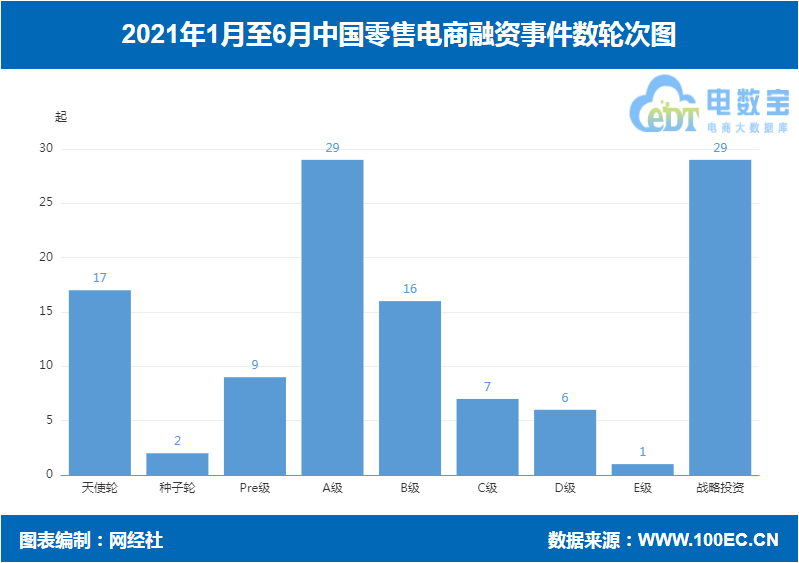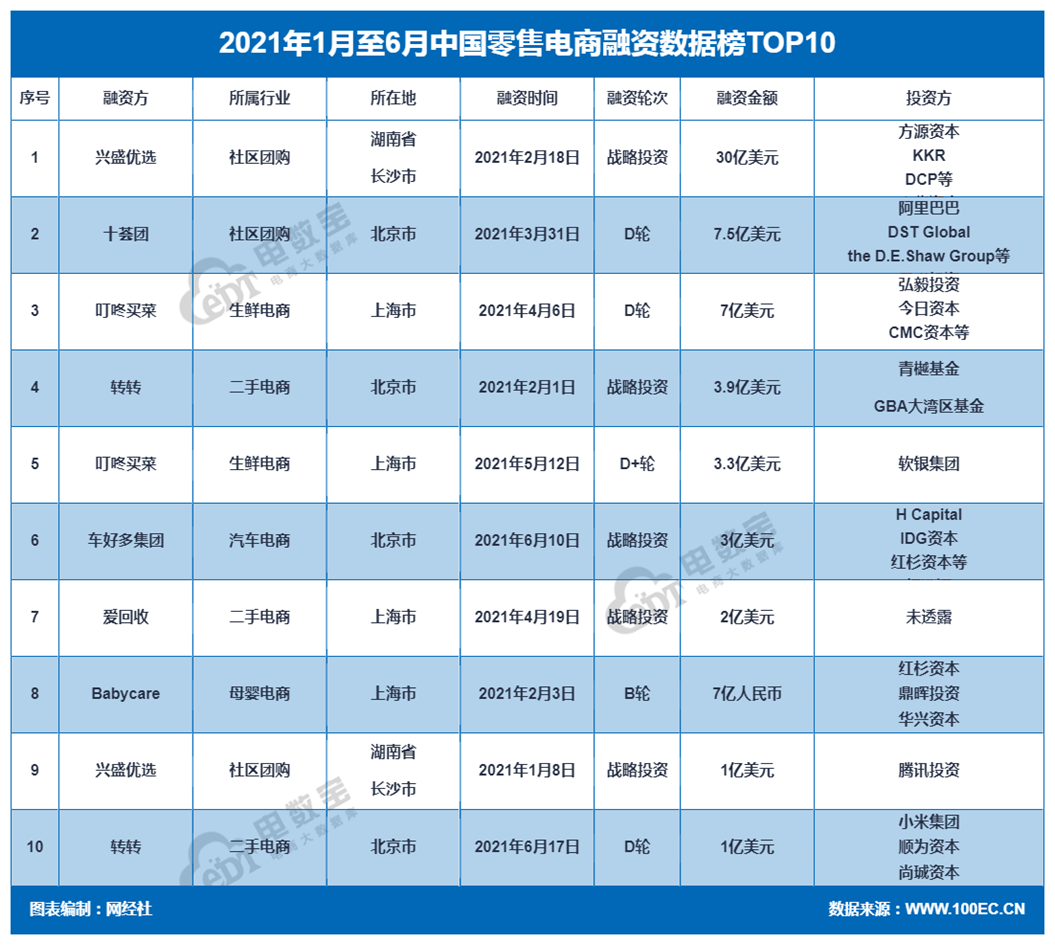 上半年零售电商十大融资事件分别为:兴盛优选(30亿美元)、十荟团(7.5亿美元)、叮咚买菜(7亿美元)、转转(3.9亿美元)、叮咚买菜(3.3亿美元)、车好多集团(3亿美元)、爱回收(2亿美元)、Babycare(7亿人民币)、兴盛优选(1亿美元)、转转(1亿美元)。