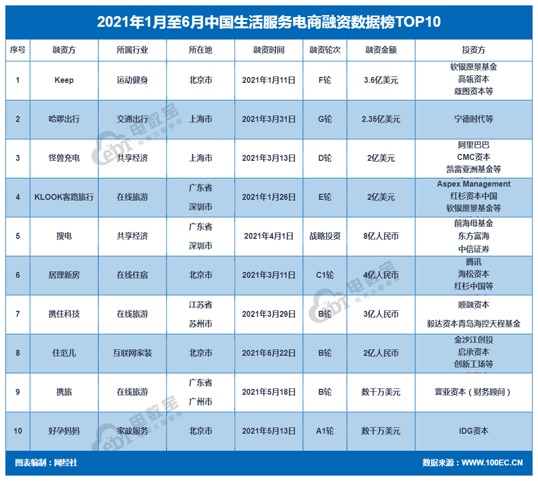 上半年生活服务电商十大融资事件有:keep(3.6亿美元)、哈啰出行(2.35亿美元)、怪兽充电(2亿美元)、KLOOK客路旅行(2亿美元)、搜电(8亿人民币)、居理新房(4亿人民币)、携住科技(3亿人民币)、住范儿(2亿人民币)、携旅(数千万美元)、好孕妈妈(数千万美元)。