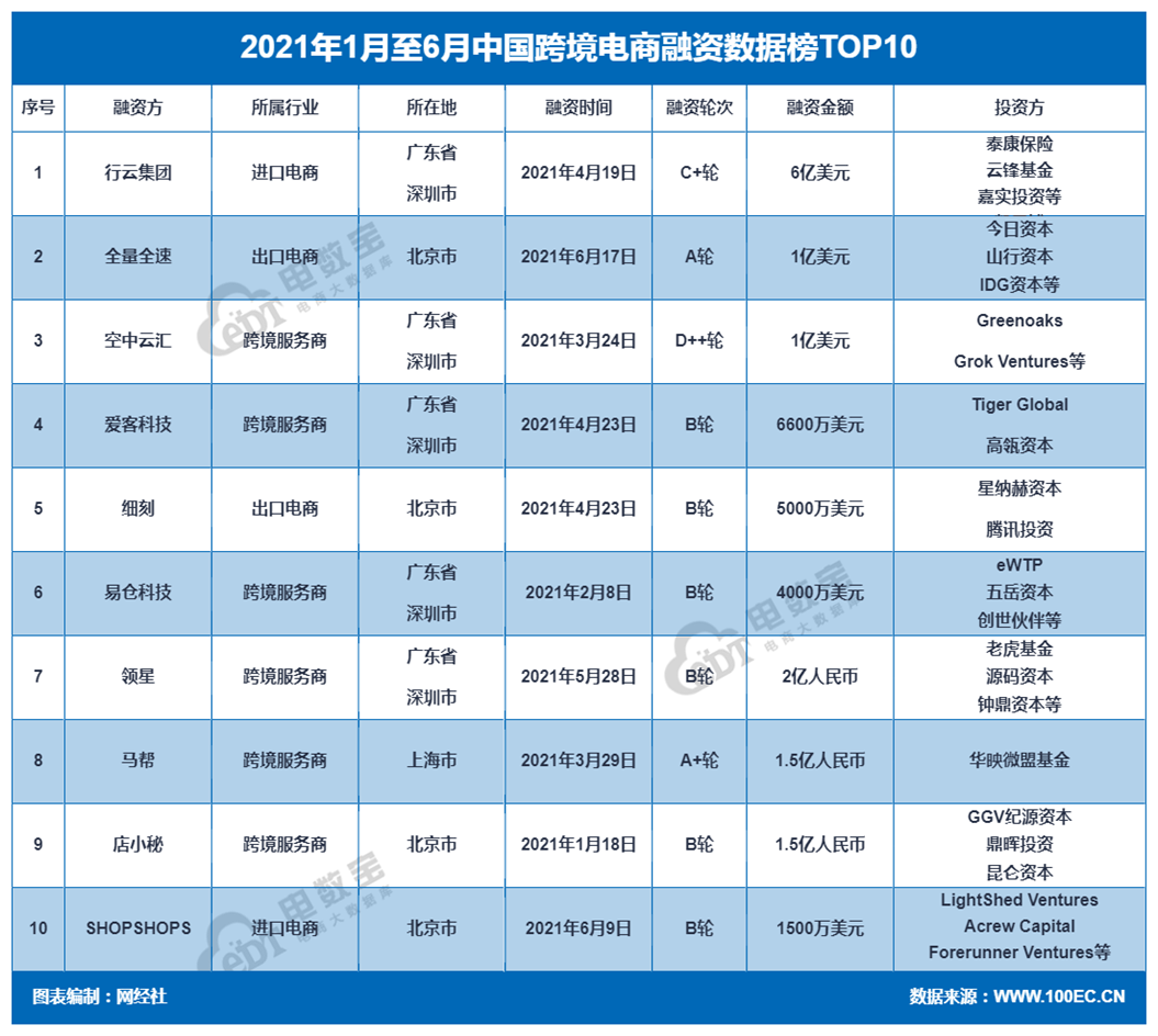 上半年跨境电商十大融资事件有:行云集团(6亿美元)、全量全速(1亿美元)、空中云汇(1亿美元)、爱客科技(6600万美元)、细刻(5000万美元)、易仓科技(4000万美元)、领星( 2亿人民币)、马帮(1.5亿人民币)、店小秘(1.5亿人民币)、 SHOPSHOPS (1500万美元)。