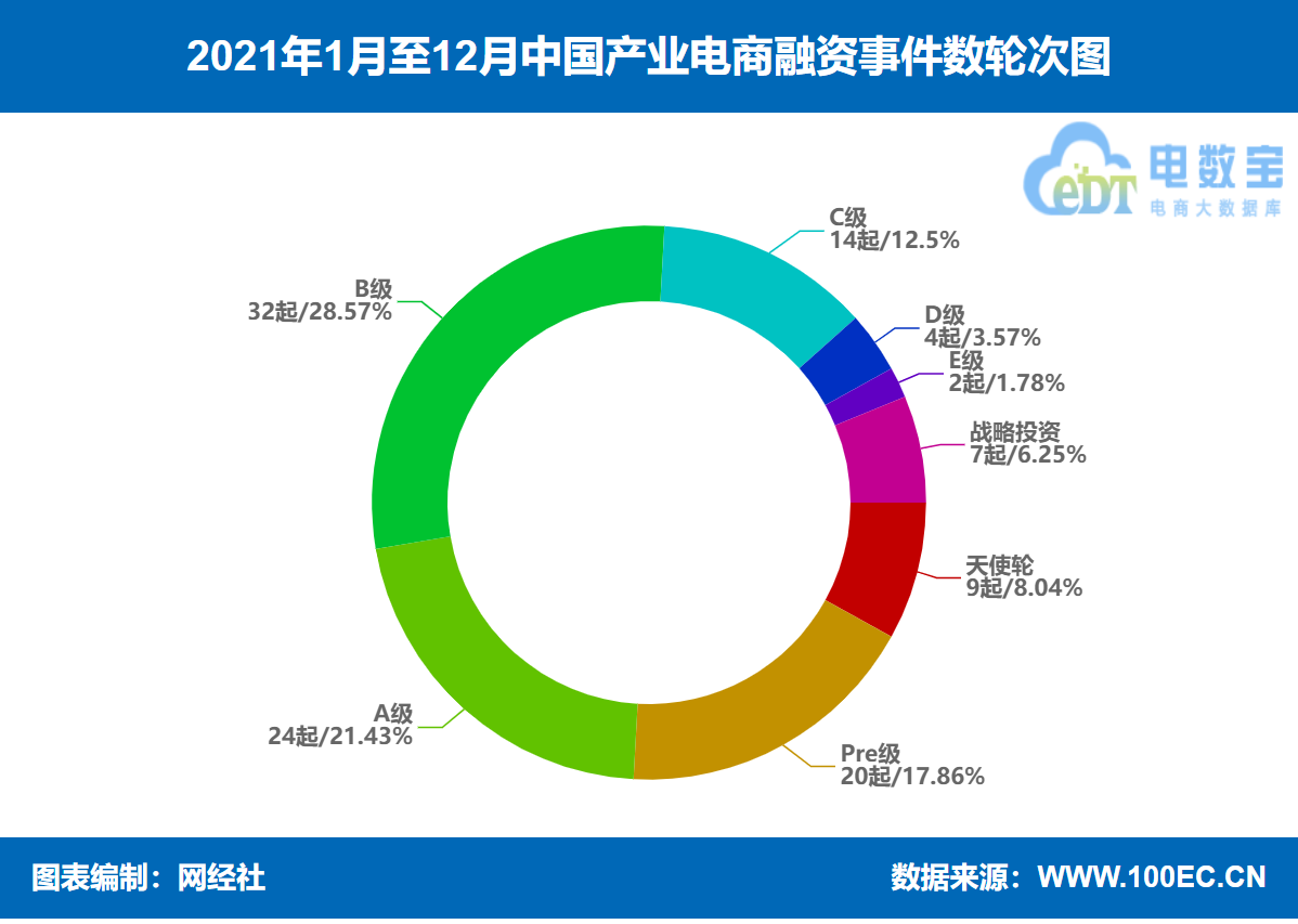 据网经社旗下电商大数据库“电数宝”监测数据显示,2021年中国产业电商共发生115起融资。其中,天使轮9起、Pre轮20起、A轮24起、B轮32起、C轮14起、D轮4起、E轮2起、战略投资7起。