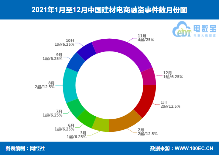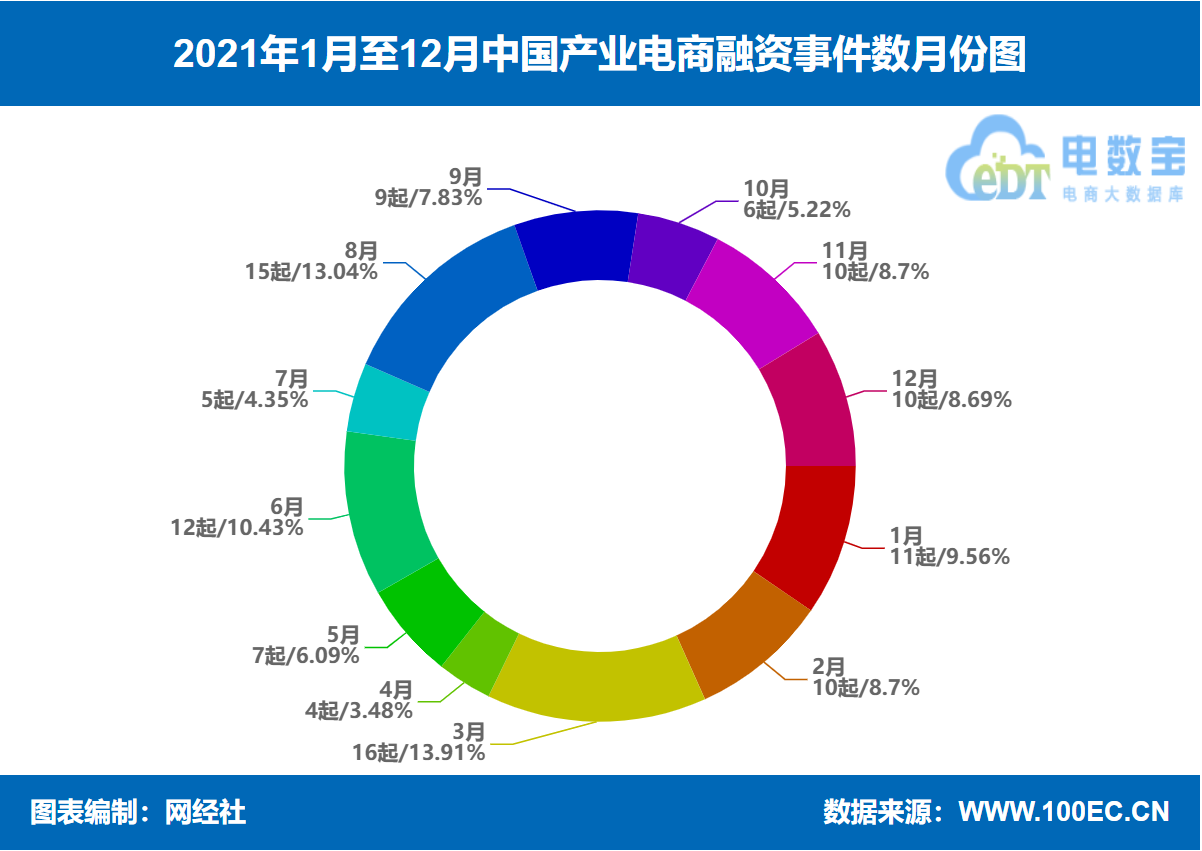 据网经社旗下电商大数据库“电数宝”监测数据显示,2021年中国产业电商融资事件数月份分布上,排名前四的月份是3月、8月、6月、1月各为16起、15起、12起、11起。