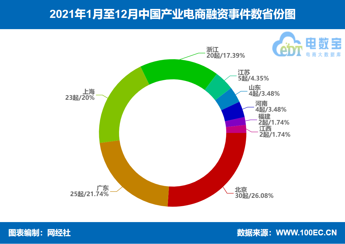 据网经社旗下电商大数据库“电数宝”监测数据显示,2021年中国产业电商融资事件数省份分布上,排名前三的分别是:北京30起占比26.08%、广东25起占比21.74%、上海23起占比20%