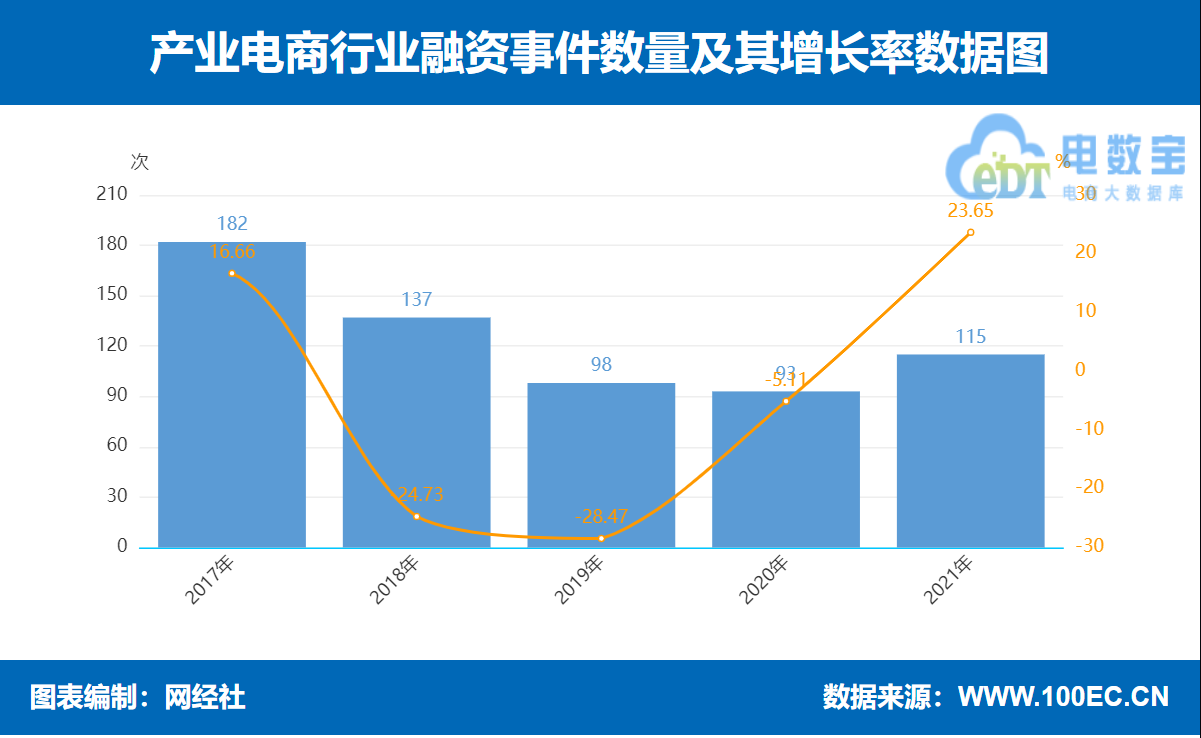 据网经社旗下电商大数据库“电数宝”监测数据显示,2021年中国产业电商共发生115起融资,同比增长23.65%。