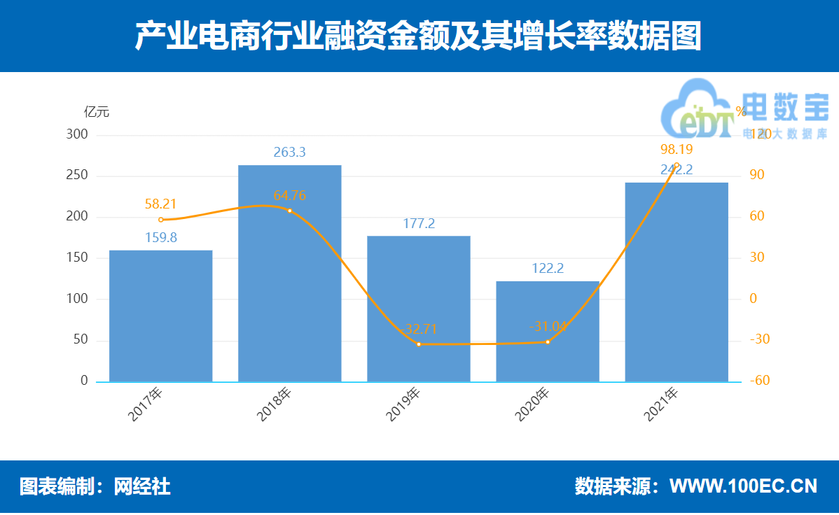 据网经社旗下电商大数据库“电数宝”监测数据显示,2021年中国产业电商融资总额242.2亿元,同比增长98.19%。