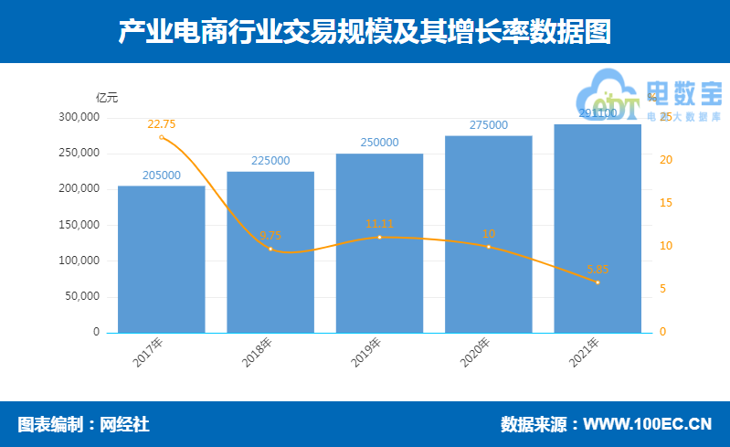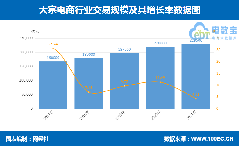 据网经社“电数宝”电商大数据库显示,2021年中国大宗电商市场规模达22.95万亿元,较2020年的22万亿元同比增长4.31%。