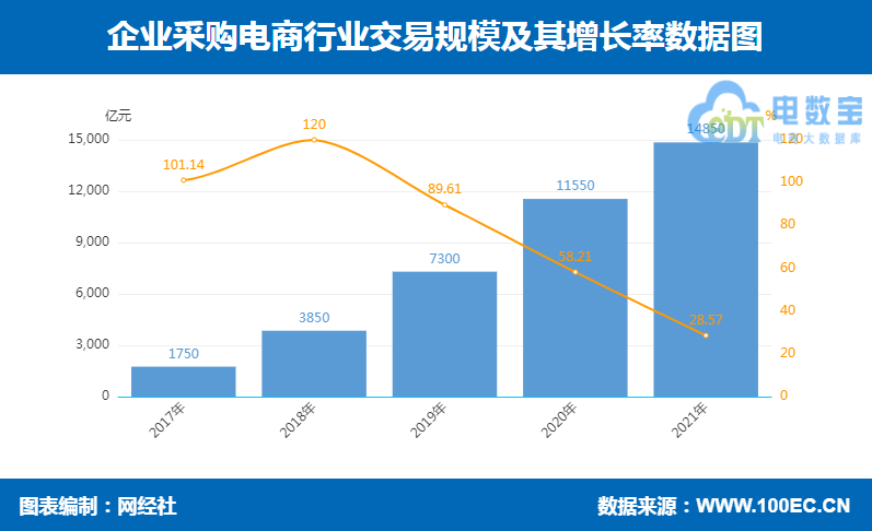 据网经社“电数宝”电商大数据库显示,2021年中国企业采购电商市场规模14850亿元,较2020年的11550亿元同比增长28.57%。