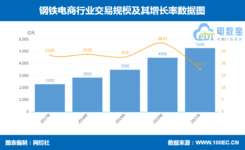 据网经社“电数宝”电商大数据库显示,2021年中国钢铁电商市场规模5300亿元,较2020年的4500亿元同比增长17.77%。