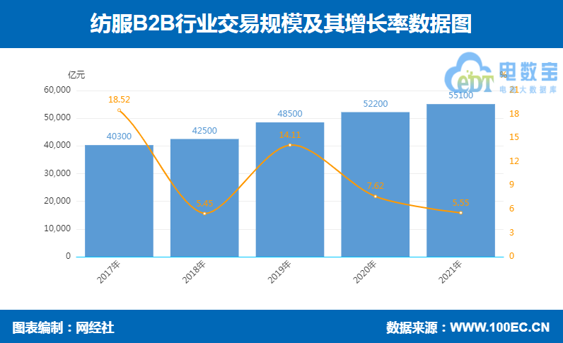 据网经社“电数宝”电商大数据库显示,2021年中国纺服B2B电商市场规模55100亿元,较2020年的52200亿元同比增长5.55%。
