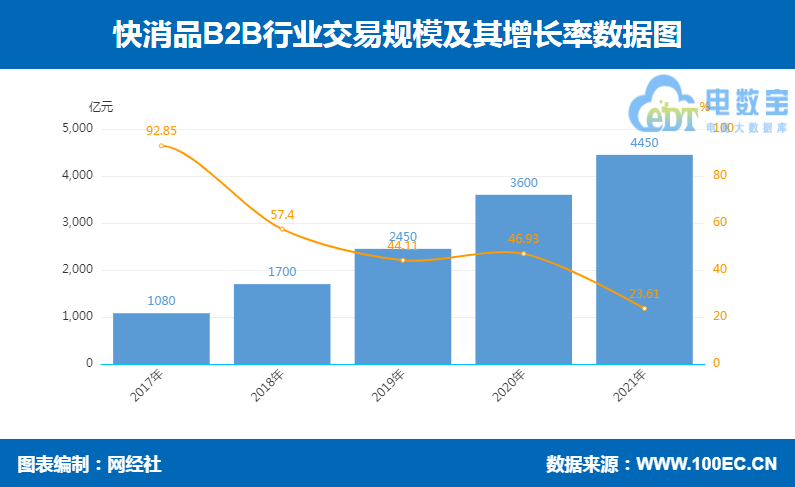据网经社“电数宝”电商大数据库显示,2021年中国快消品B2B电商市场规模4450亿元,较2020年的3600亿元同比增长23.61%。