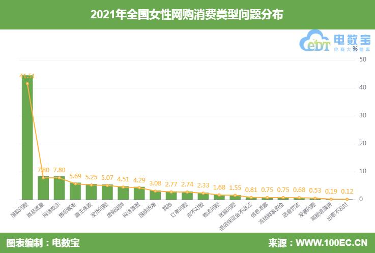 据“电诉宝”显示,2021年全国女性网购用户投诉问题类型排名前十的依次为:退款问题(41.51%)、商品质量(7.80%)、网络欺诈(7.80%)、售后服务(5.69%)、霸王条款(5.25%)、发货问题(5.07%)、虚假促销(4.51%)、退换货难(3.08%)、其它(2.77%)、订单问题(2.74%)。可以看出,女性购物时,考虑的因素除了价格、品质等传统购物因素之外,售后问题、促销玩法、发货时效性都可能成为限制女性下单的理由。