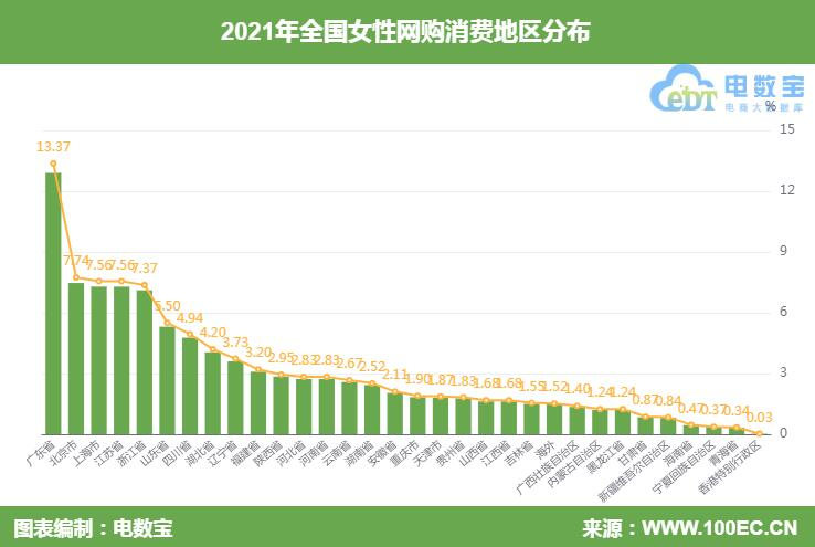 2021年“电诉宝”受理投诉女性网购用户聚集地区TOP20依次为广东省(13.37%)、北京市(7.74%)、上海市(7.56%)、江苏省(7.56%)、浙江省(7.37%)、山东省(5.50%)、四川省(4.94%)、湖北省(4.20%)、辽宁省(3.73%)、福建省(3.20%)、陕西省(2.95%)、河北省(2.83%)、河南省(2.83%)、云南省(2.67%)、湖南省(2.52%)、安徽省(2.11%)、重庆市(1.90%)、天津市(1.87%)、贵州省(1.83%)、山西省(1.68%)。