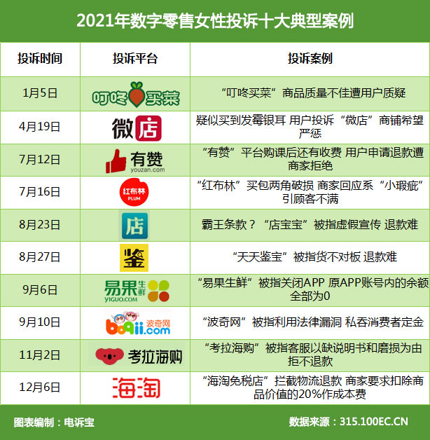 2021年女性网购在数字零售领域中,据“电诉宝”受理用户维权案例,我们从中选取十大典型投诉案例,涉及叮咚买菜、微店、有赞、红布林、店宝宝、天天鉴宝、易果生鲜、波奇网、考拉海购、海淘免税店。