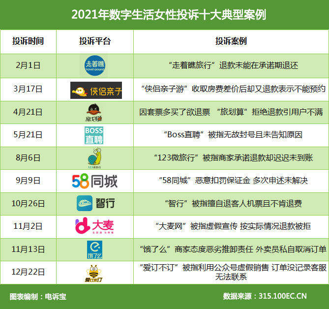 2021年女性网购在数字生活领域中,据“电诉宝”受理用户维权案例,我们从中选取十大典型投诉案例,涉及走着瞧旅行、侠侣亲子、旅划算、Boss直聘、123微旅行、58同城、智行、飞猪、大麦网、饿了么。