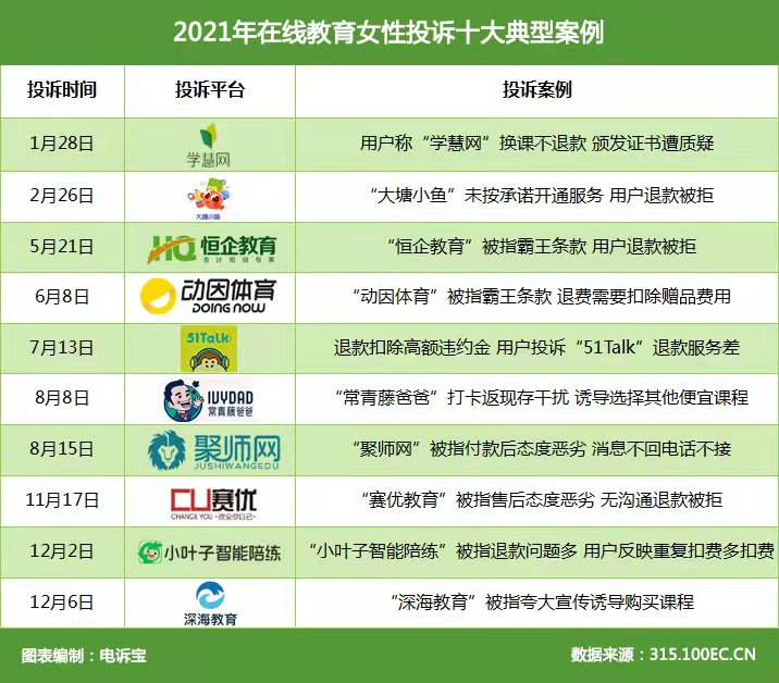 2021年女性网购在在线教育领域中,据“电诉宝”受理用户维权案例,我们从中选取十大典型投诉案例,涉及学慧网、大塘小鱼、恒企教育、动因体育、51Talk、常青藤爸爸、聚师网、赛优教育、小叶子智能陪练、深海教育。