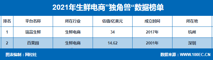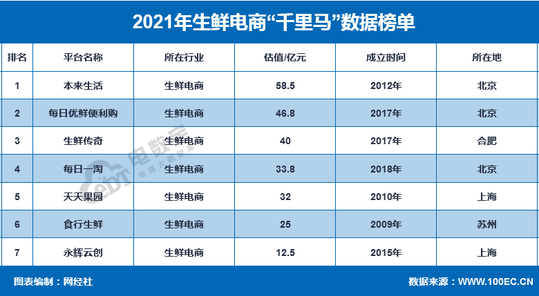 据网经社“电数宝”电商大数据库显示,2021年生鲜电商千里马8家,分别是本来生活、每日优鲜便利购、生鲜传奇、每日一淘、天天果园、食行生鲜、永辉云创,估值分别为58.5亿元、46.8亿元、40亿元、33.8亿元、32亿元、25亿元、12.5亿元,总估值达248.6亿元。