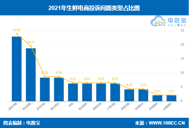 国内知名网络消费纠纷调解平台“电诉宝”受理用户维权案例显示,退款问题、商品质量、发货问题、霸王条款、售后服务、虚假促销、订单问题、客服问题、网络欺诈、网络售假等是2021年期间生鲜电商投诉的主要问题。